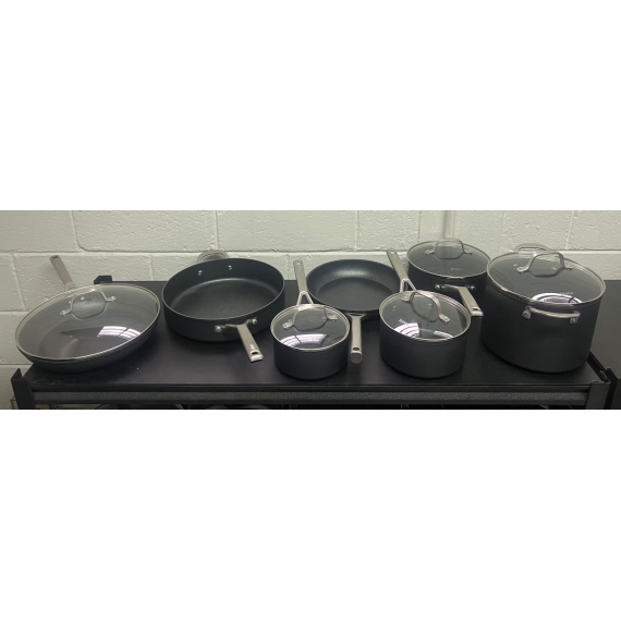 Juego de 12 piezas, incluye varias ollas, sartenes y tapas.