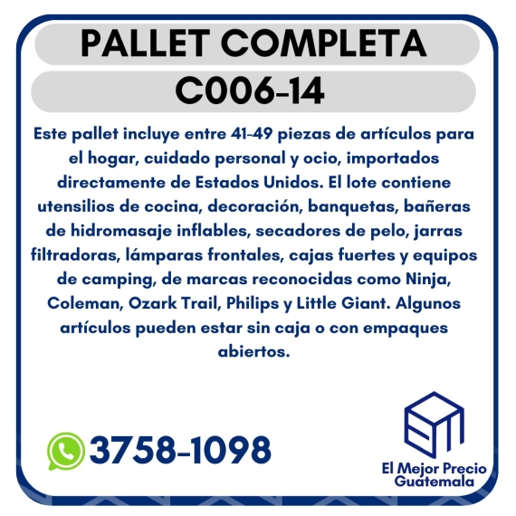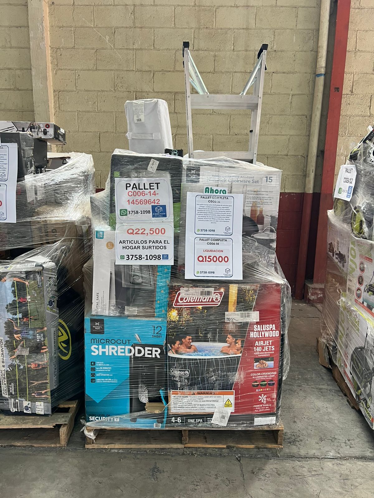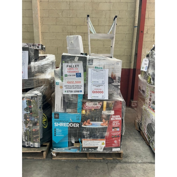 Este pallet incluye entre 41-49 piezas de artículos para el hogar, cuidado personal y ocio, importados directamente de Estados Unidos. El lote contiene utensilios de cocina, decoración, banquetas, bañeras de hidromasaje inflables, secadores de pelo, jarras filtradoras, lámparas frontales, cajas fuertes y equipos de camping, de marcas reconocidas como Ninja, Coleman, Ozark Trail, Philips y Little Giant. Algunos artículos pueden estar sin caja o con empaques abiertos.