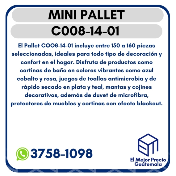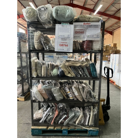El Pallet COO8-14-01 incluye entre 150 a 160 piezas seleccionadas, ideales para todo tipo de decoración y confort en el hogar. Disfruta de productos como cortinas de baño en colores vibrantes como azul cobalto y rosa, juegos de toallas antimicrobia y de rápido secado en plata y teal, mantas y cojines decorativos, además de duvet de microfibra, protectores de muebles y cortinas con efecto blackout.