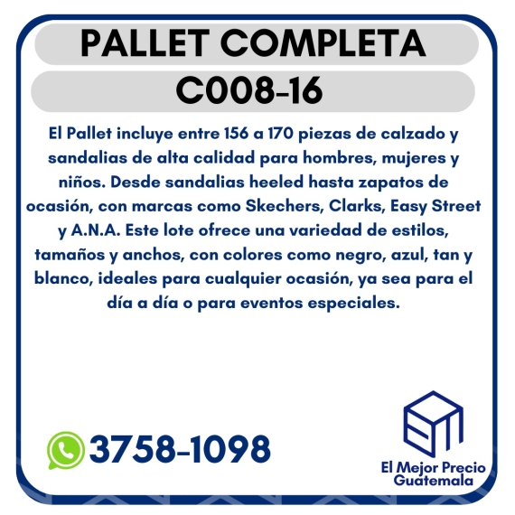 El Pallet COO8-16-14513630 incluye entre 167 a 170 pares de calzado y sandalias de alta calidad para hombres, mujeres y niños. Desde sandalias heeled hasta zapatos de ocasión, con marcas como Skechers, Clarks, Easy Street y A.N.A. Este lote ofrece una variedad de estilos, tamaños y anchos, con colores como negro, azul, tan y blanco, ideales para cualquier ocasión, ya sea para el día a día o para eventos especiales.