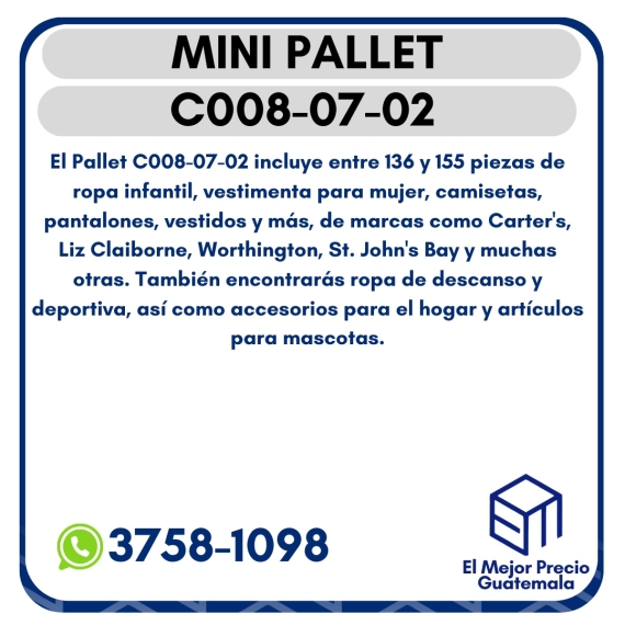 El Pallet COO8-07-02 incluye ropa infantil, vestimenta para mujer, camisetas, pantalones, vestidos y más, de marcas como Carter's, Liz Claiborne, Worthington, St. John's Bay y muchas otras. También encontrarás ropa de descanso y deportiva, así como accesorios para el hogar y artículos para mascotas.