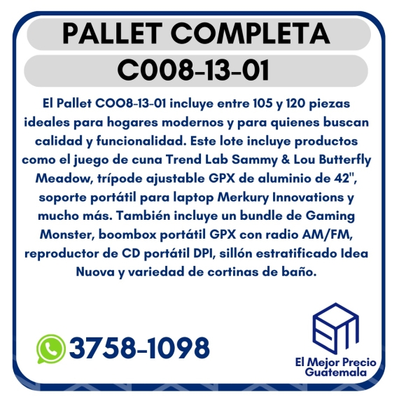 El Pallet COO8-13-01 ideales para hogares modernos y para quienes buscan calidad y funcionalidad. Este lote incluye productos como el juego de cuna Trend Lab Sammy & Lou Butterfly Meadow, trípode ajustable GPX de aluminio de 42", soporte portátil para laptop Merkury Innovations y mucho más. También incluye un bundle de Gaming Monster, boombox portátil GPX con radio AM/FM, reproductor de CD portátil DPI, sillón estratificado Idea Nuova y variedad de cortinas de baño.