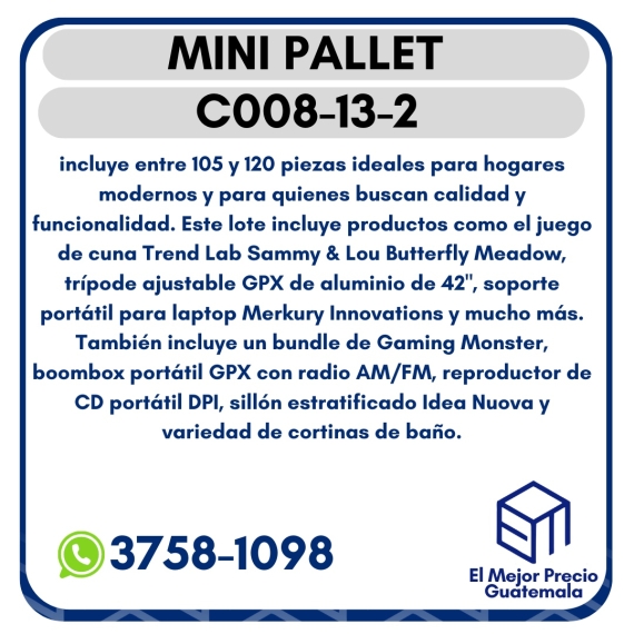 El Pallet COO8-13-02 ideales para hogares modernos y para quienes buscan calidad y funcionalidad. Este lote incluye productos como el juego de cuna Trend Lab Sammy & Lou Butterfly Meadow, trípode ajustable GPX de aluminio de 42", soporte portátil para laptop Merkury Innovations y mucho más. También incluye un bundle de Gaming Monster, boombox portátil GPX con radio AM/FM, reproductor de CD portátil DPI, sillón estratificado Idea Nuova y variedad de cortinas de baño.