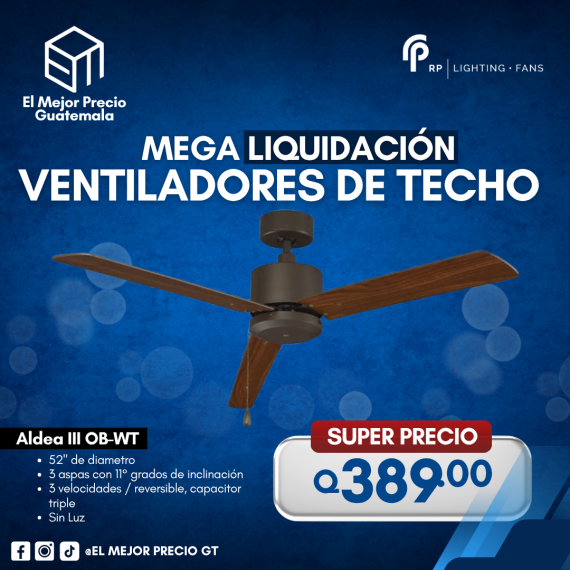 52" de diámetro, 3 aspas, inclinación 11° 76" de cable, barra de extensión 4" 3 velocidades / reversible, capacitor triple